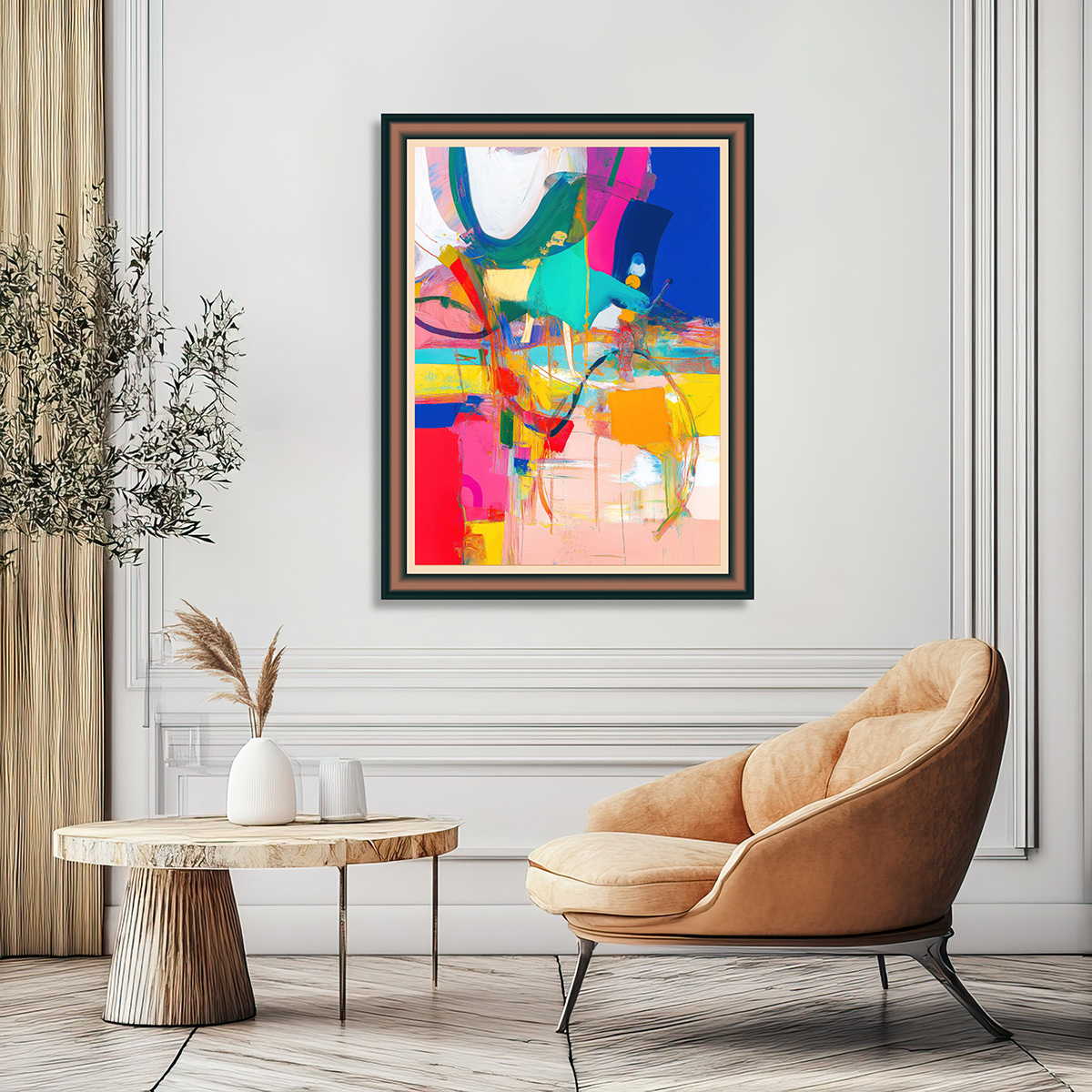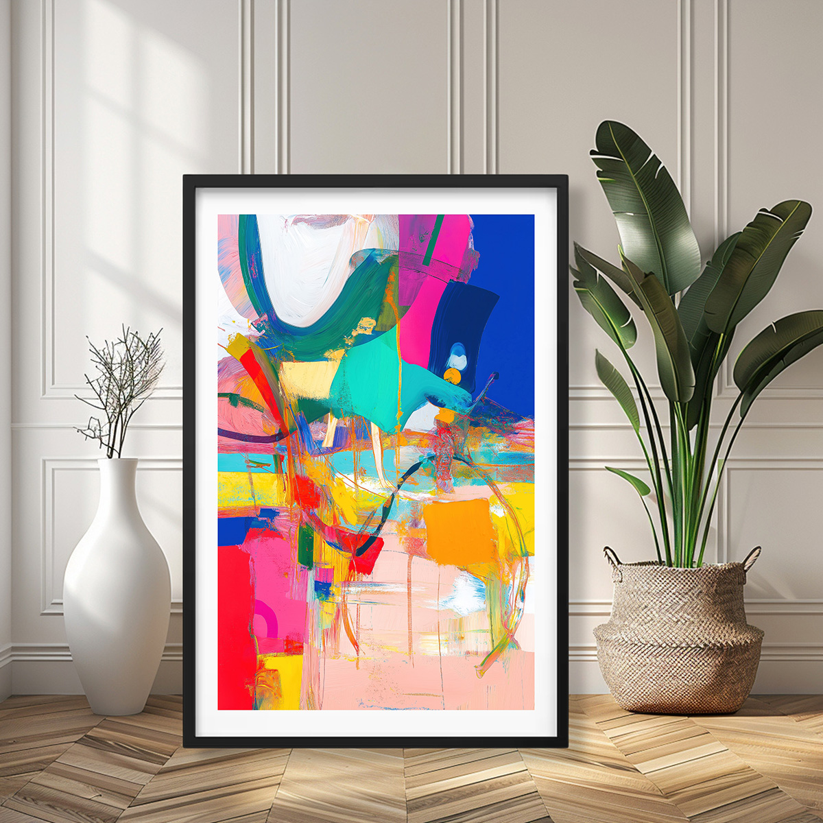 A vibrant collision of bold strokes, neon hues, and dynamic forms—evoking movement, chaos, and joy in a surreal, dreamlike landscape.
